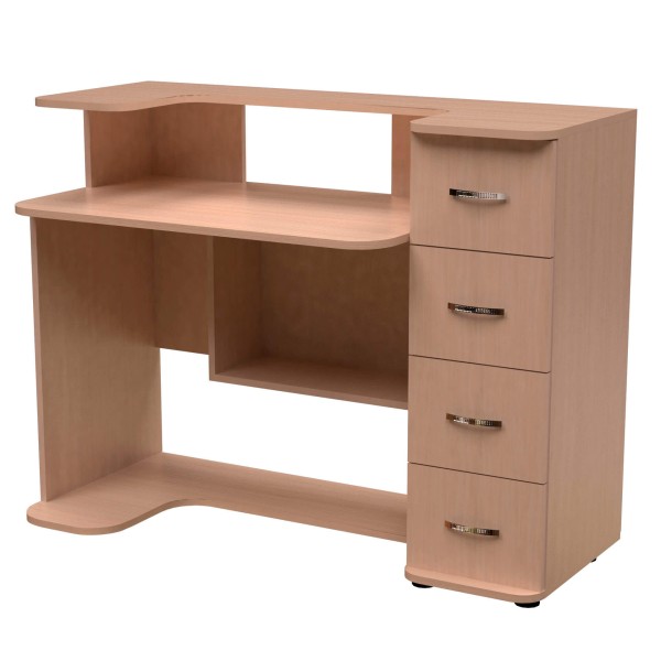 Комп'ютерний стіл на фігурній основі. Прямий, 1200 мм завширшки. Полиця для монітора та колонок повторює форму основи. Між полицею та основою вбудована тумба з чотирьох шухляд. Ширина стільниці - 898 мм. Під стільницею - невелика полиця на рівні колін та відсік для системного блоку. Стіл розміщений на 7-ми ніжках.