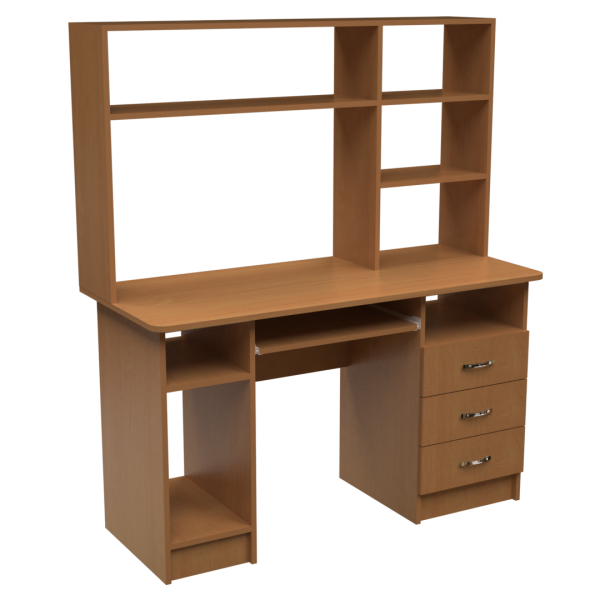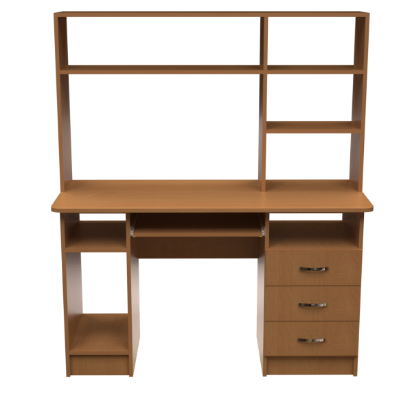 Прямий комп'ютерний стіл з багатою конфігурацією. Надбудова - це відкриті полиці, найвища з яких знаходиться на висоті стола - 1500 мм. Під стільницею - тумба з трьома шухлядами та полицею, відсік для системного блоку з полицею та полиця під клавіатуру.