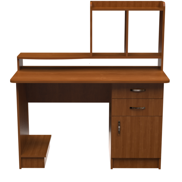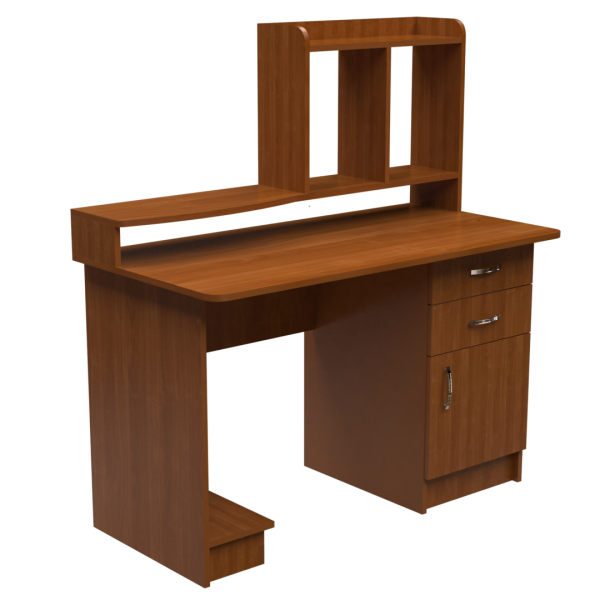 Прямий комп'ютерний стіл з надбудовою. Надбудова - полиця для монітора по ширині стола, над якою полиця для колонок, 570 см завширшки. Стільниця спирається на тумбу з двох шухляд та шафки. Підставка для системного блок приєднана до ніжки стола та стоїть на підлозі.