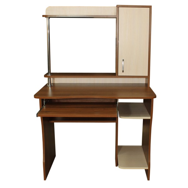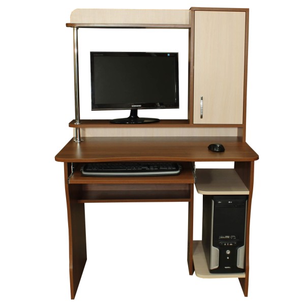 Вузький комп'ютерний стіл з надбудовою має відсік для системного блоку, полицю під клавіатуру, полицю для монітора та полицю для колонок, яка розташована над монітором. З одного боку стола, між полицями для монітора та колонок - декоративна металева хромована стійка, з іншого - шафка на всю висоту надбудови. Висота з надбудовою - 1450 мм.