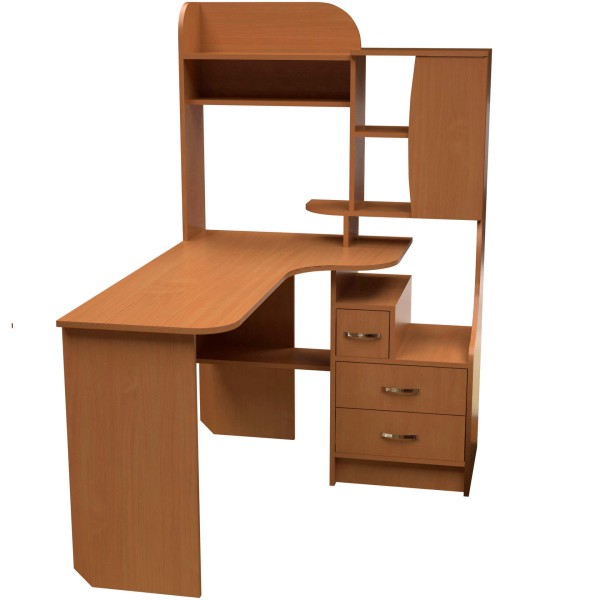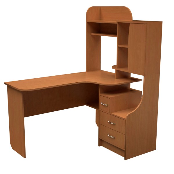 Кутовий стіл з надбудовою, оснащений трьома висувними шухлядами та шафкою. Блок шухляд не стандартний, одна з шухляд має меншу ширину. Шафка та полиці розташовані у надбудові. Під хвилеподібною стільницею - невелика поличка. Висота столу з надбудовою - 1530 мм, глибина - 1300 мм та ширина - 1000 мм.