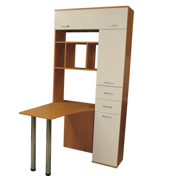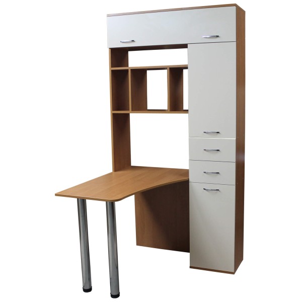 Комп'ютерний стіл з надбудовою. Стільниця кутового столу на металевих хромованих ніжках. Надбудова представлена полицями та шафками. Шафки розташовані горизонтально - вздовж надбудови та вертикально - одна у надбудові, інша - внизу столу. Між вертикальними шафками, на рівні стільниці - дві шухляди.
