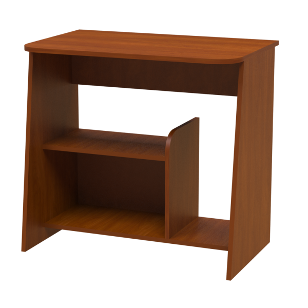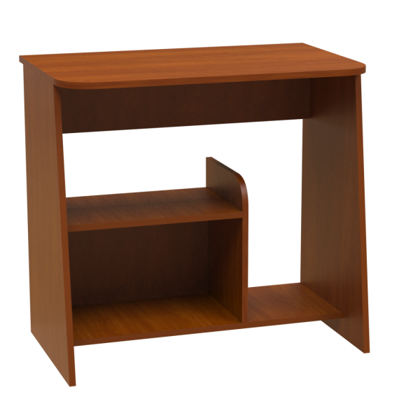 Прямий комп'ютерний стіл, вузький, 800 мм завширшки. Стіл має дві полиці, одна з яких з задньою стінкою. Передбачено місце для системного блоку.