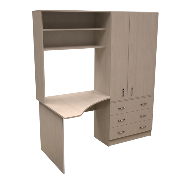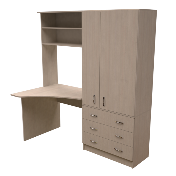 Широкий кутовий комп'ютерний стіл з надбудовою та шафою, 1600 мм завширшки. Дві полиці з задньою стінкою у надбудові по ширині стільниці - 900 мм. Шафа складається з двохдверної шафки та комоду з трьома висувними шухлядами. У вузькій частині шафки - чотири полиці.