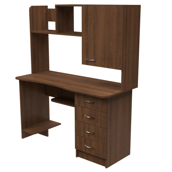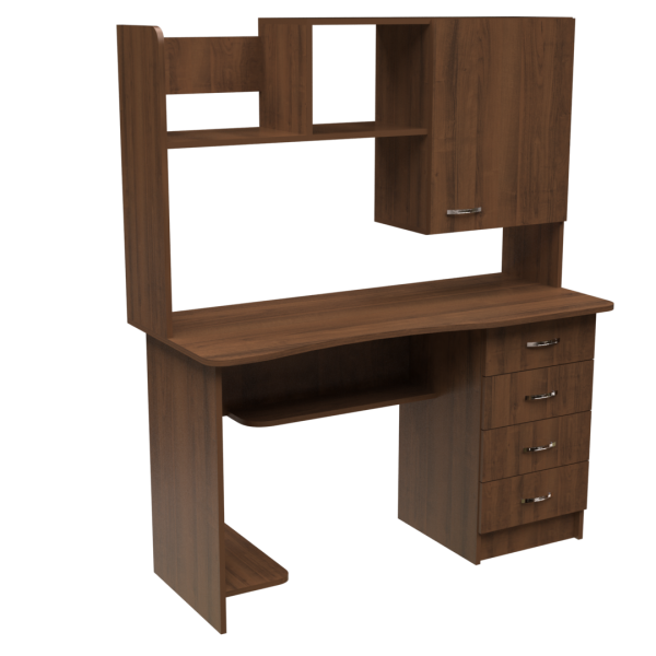 Прямий комп'ютерний стіл з шафкою та двома полицями у надбудові. Тумба з чотирьох шухляд, підставка під системний блок та полиця на рівні колін шириною 600 мм знаходяться під стільницею. Стільниця хвилеподібної форми.