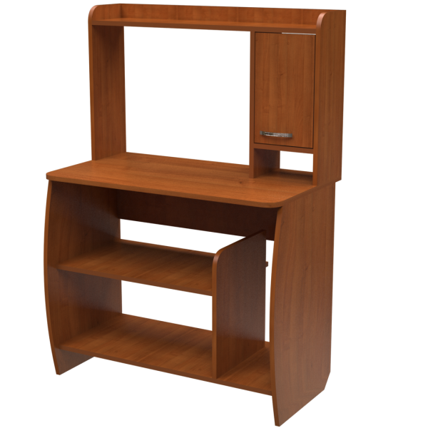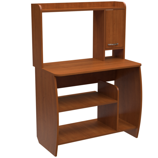 Прямий комп'ютерний стіл з надбудовою, 1300 мм заввишки. Полиця по ширині столу та шафка під нею розміщені у надбудові. Внутрішній розмір шафки - 218x200 мм. Під стільницею стіл має дві відкриті полиці, одна з яких - 634x400 мм. Відсік для системного блоку межує з полицями.