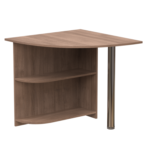 Кутовий комп'ютерний стіл на металевій хромованій ніжці. Стільниця стола загруглена, має вигляд сектору, розмір - 800x800 мм. Дві кутові полиці - під стільницею.