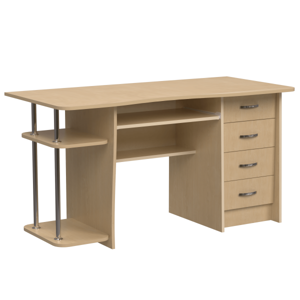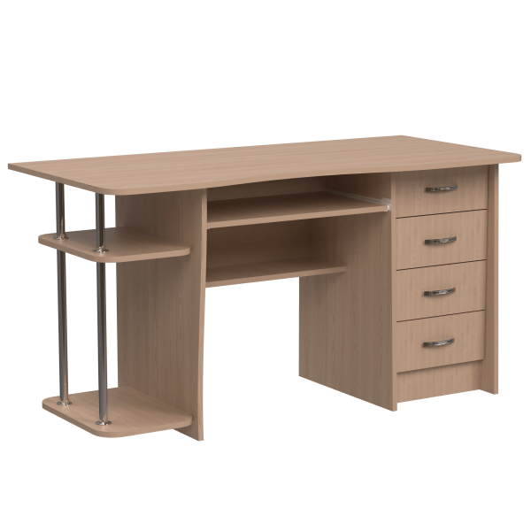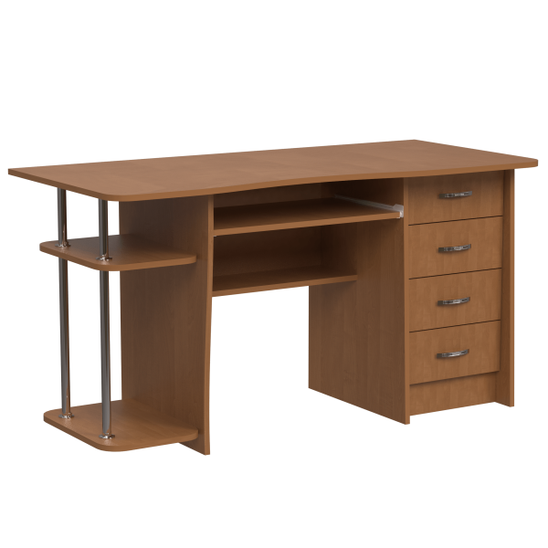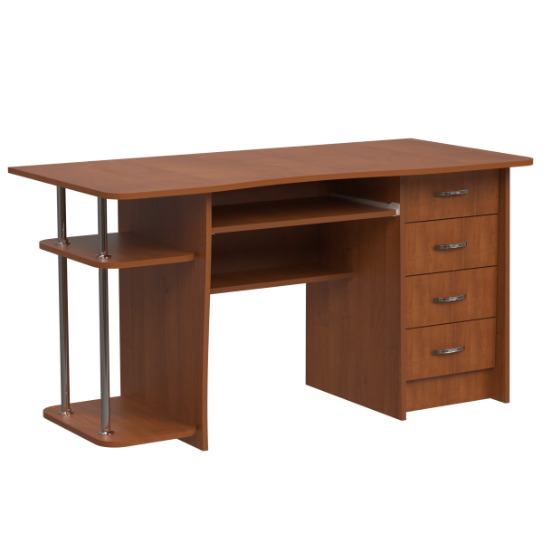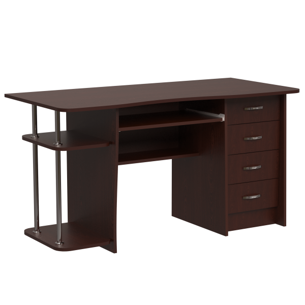 Прямий комп'ютерний стіл. Тумба з чотирьох шухляд розташована поруч з полицею під клавіатуру. Маленька поличка створена на рівні колін. Дві відкриті полиці, між якими металеві хромовані стійки, приєднані до зовнішньої сторони ніжки стола.