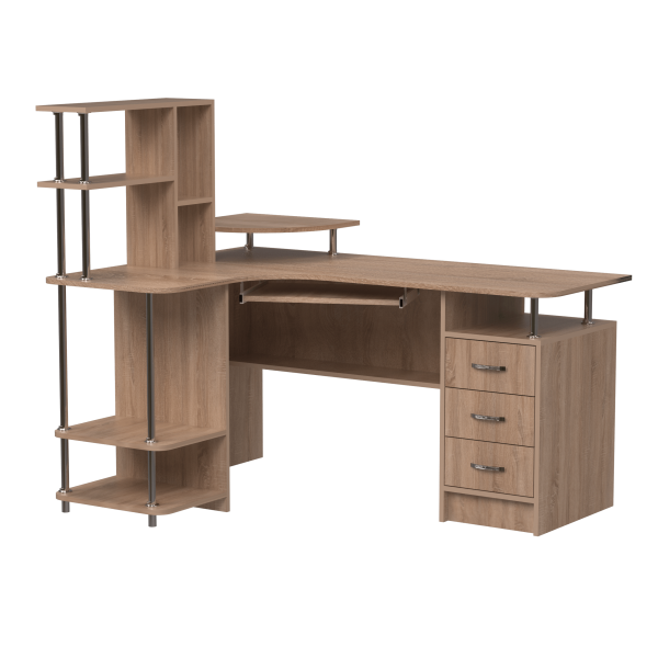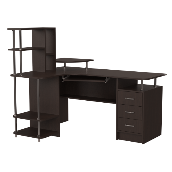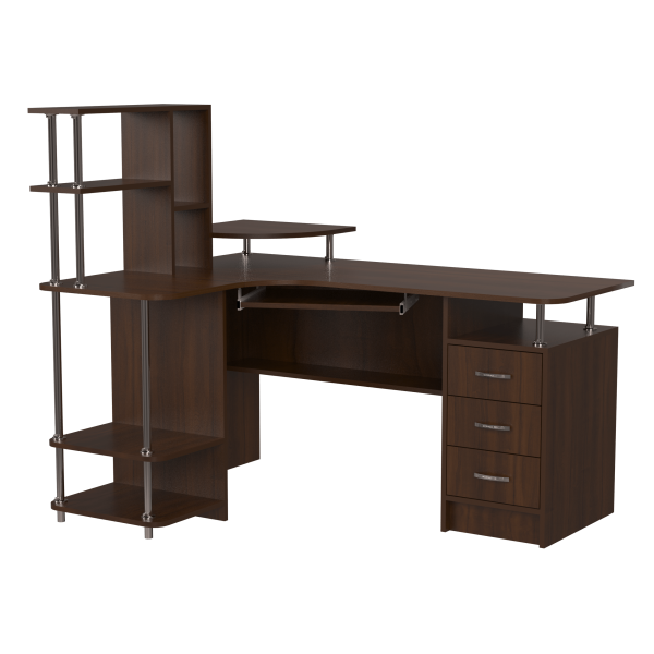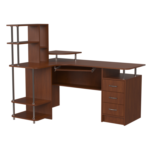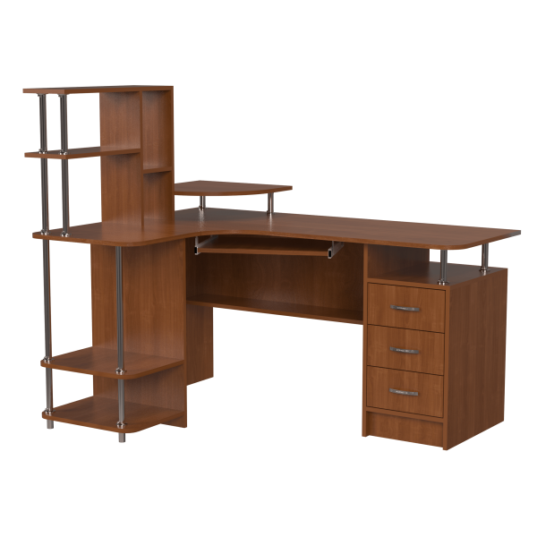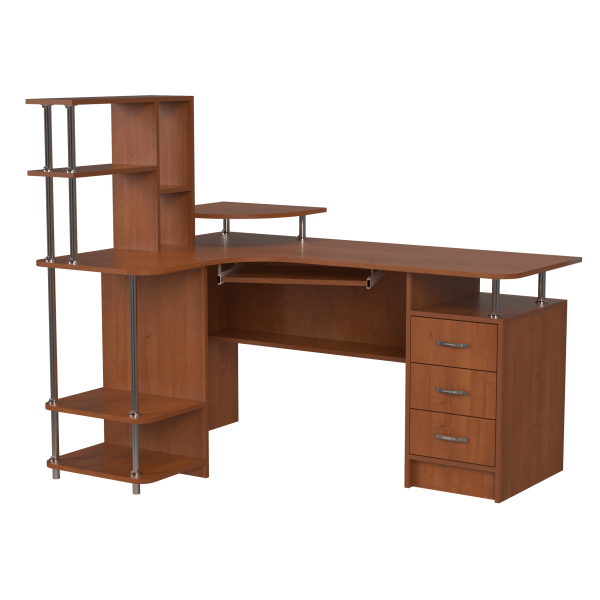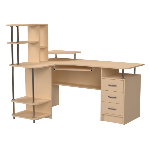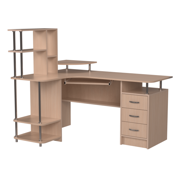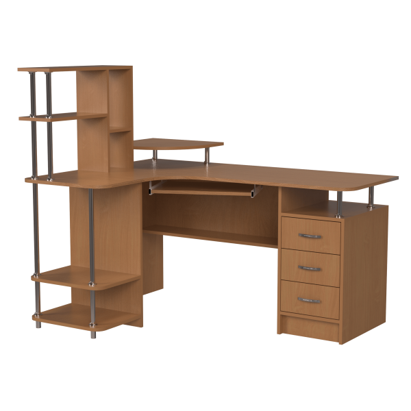 Кутовий комп'ютерний стіл з багатою комплектацією. Стіл має трикутну полицю для монітору на металевих хромованих стійках, полицю під клавіатуру, невелику полицю на рівні колін. Стільниця спирається на тумбу з трьох шухляд металевими хромованими стійками, де утворилась відкрита полиця. З іншої сторони стола - дві відкриті полиці, між якими металеві хромовані стійки, приєднані до зовнішньої сторони ніжки стола. Надбудова - це конструкція з відкритих полиць, між якими металеві хромовані стійки.
