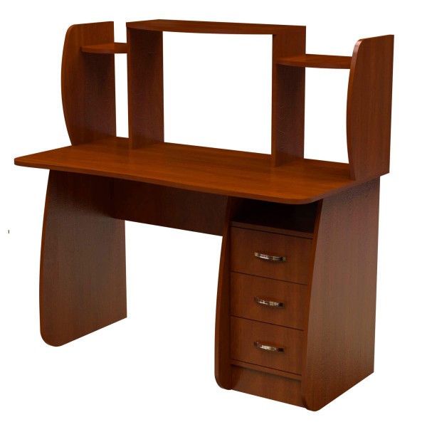 Прямий комп'ютерний стіл з трьома полицями у надбудові. Середня полиця знаходиться на висоті 1200 мм. Під стільницею - тумба з трьома шухлядами та полицею.